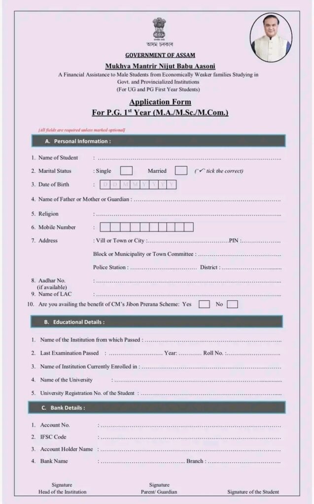 The Assam Government has a new plan to help boys in school. It is called Mukhya Mantri Nijut Babu Asoni. This plan gives money every month to male students. It helps families pay for books and fees.+1